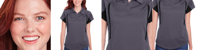 4.8 oz., 100% micro-textured polyester knit; Anti-bacterial; Moisture-wicking; Feminine fit; Flat-knit collar; 3-button placket; Hemmed sleeves; Matching shoulder panels; Side vents; Tagless;