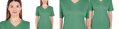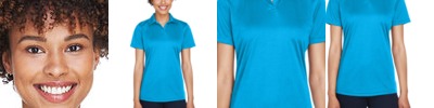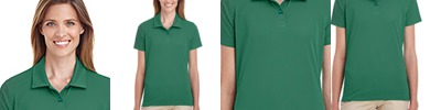 4.8 oz., 100% polyester mini-jacquard; Anti-bacterial; Moisture-wicking; Stain-resistant; UV 15-39 protection; Feminine fit; Flat-knit collar;