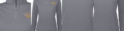 100% polyester heathered wicking knit top body, collar and sleeves ; 100% polyester wicking knit solid bottom body ; Ladies' fit ; Pad print label ; Quarter-zip pullover style; Self-fabric collar ; Set-in sleeves ;