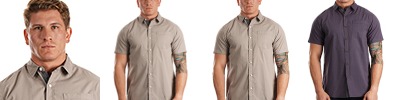 5.4 oz. 80/20 cotton/poly; 2 chest pockets with button flaps; Button cuffs; Hem bottom; Half moon back yoke; Elongated tail ; Modern fit;