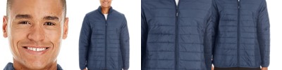 90% polyester, 10% spandex ; 100% polyester channel puffer with 3 oz. polyfil; Bonded softshell front shoulder and back; Water-resistant DWR finish; Zippered hand pockets ; Inside storm flap and chin guard ; Adjustable cuffs; Classic fit;