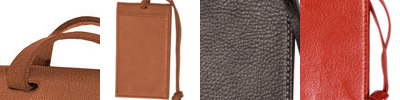 - Holds ID/business card behind clear PVC viewing window on back panel hidden by leather flap