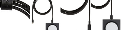 Nylon braided cable, genuine leather belt, aluminum housed charging pad, non-slip silicone base
